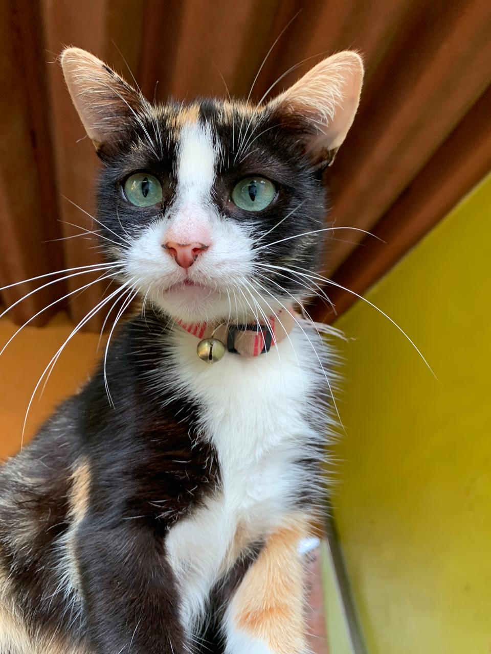 Segundo ela, um ano atrás apareceu em seu quintal uma gatinha magra, dentes quebrados e faminta. Adotou-a imediatamente.