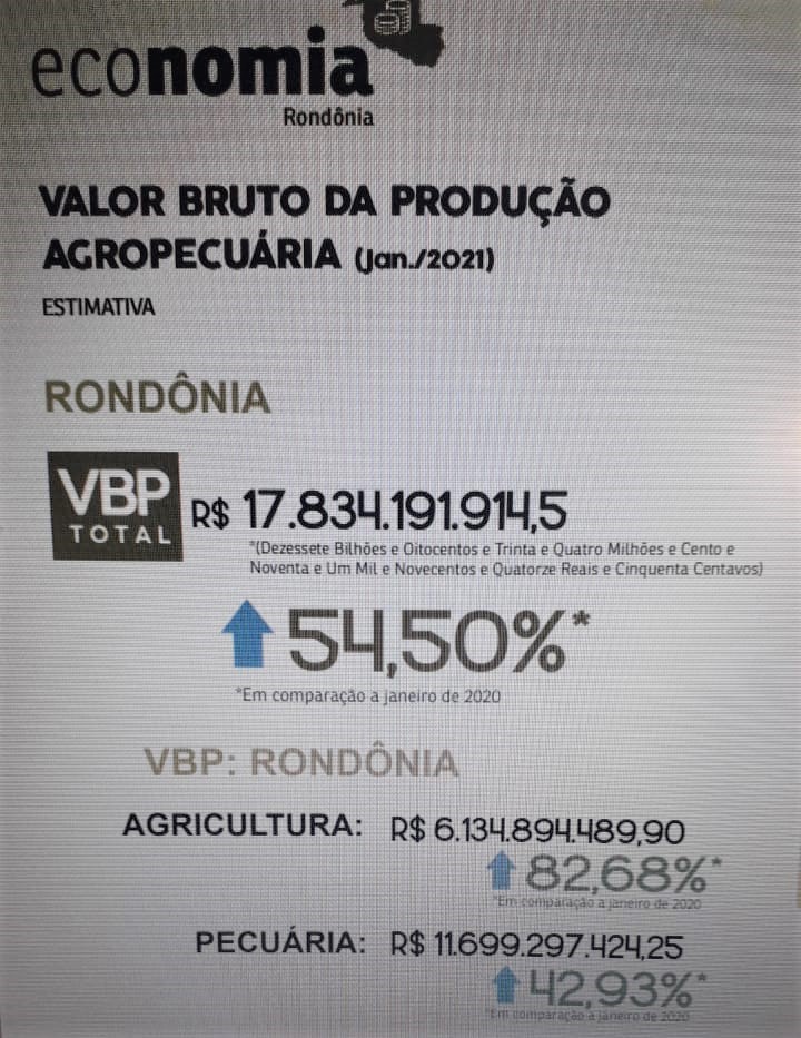 O Governo do Estado, por meio da Secretaria de Estado da Agricultura (Seagri), superou expectativas voltadas às atividades do setor agropecuário. Prova disto, é que atualmente, a agropecuária de Rondônia exibe números expressivos: Rondônia alcançou R$ 18,3 bilhões no Valor Básico da Produção (VBP), um aumento de 56,84% se comparado a igual período do ano passado. Esses números indicam o bom desempenho do setor.